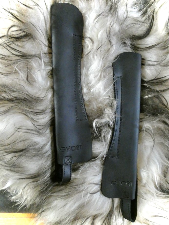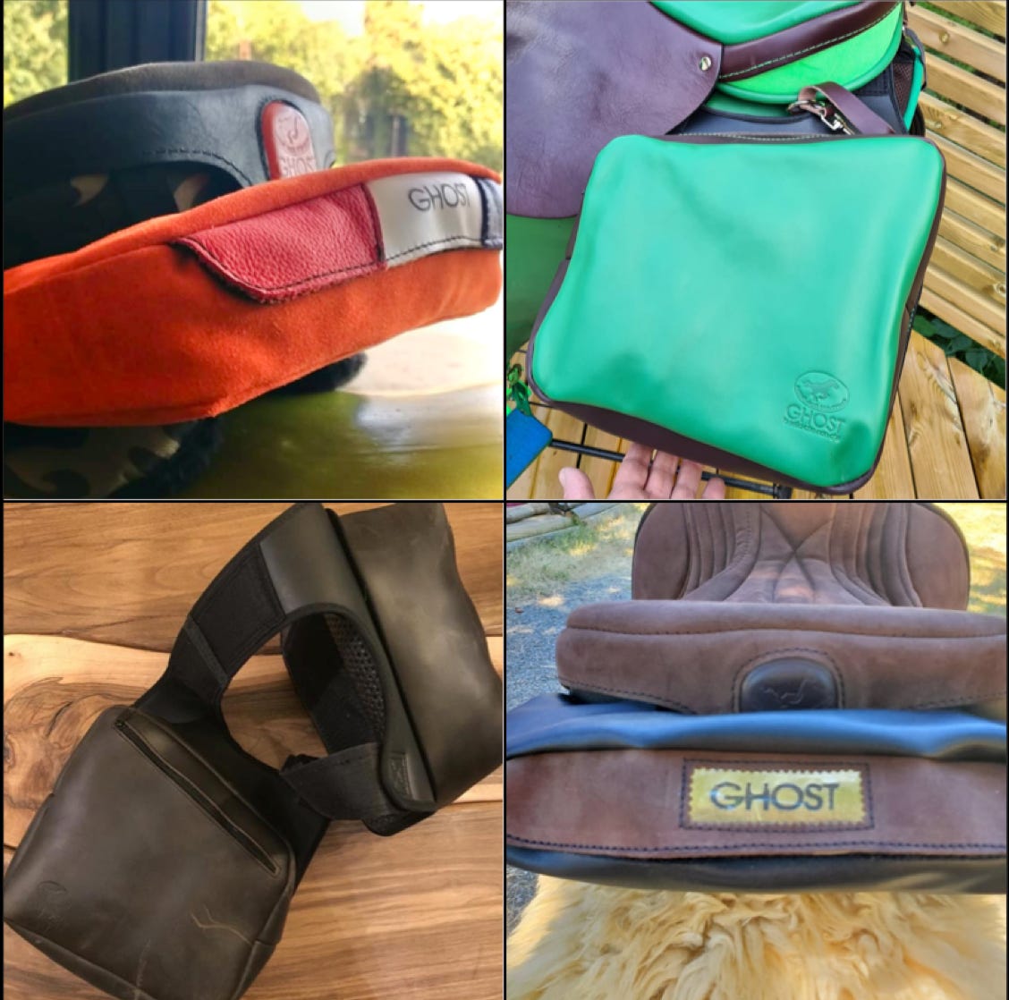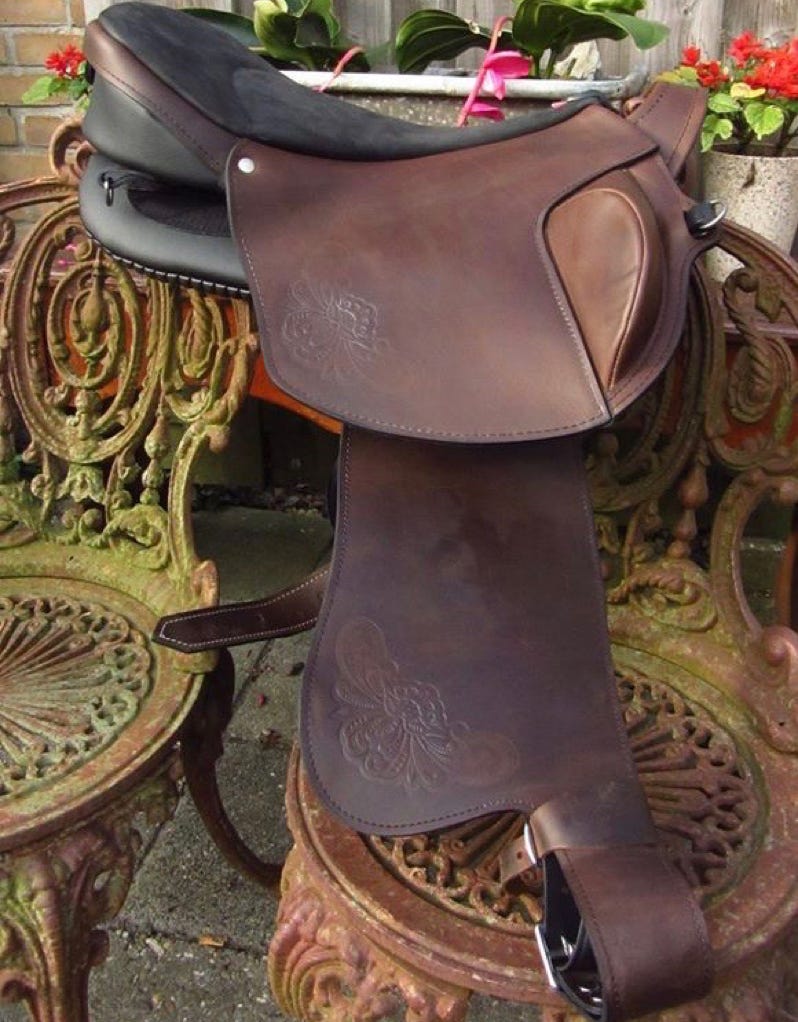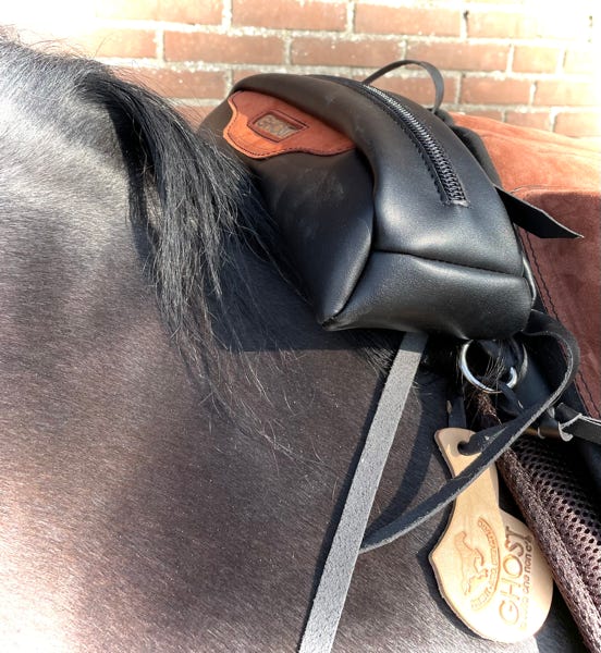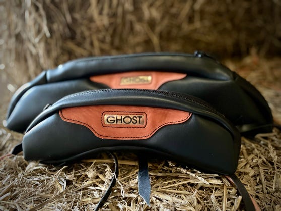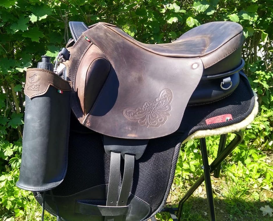 Ghost has many accessories, such as pads, girths, front risers and seat diminishers, stirrup straps, stirrups strap protectors, girth strap protectors, fenders, seat savers and Zalea’s…. each accessory is custom made to match your saddle and taste. Saddle bags and a cantle bag also available for your Ghost . Several examples are below.